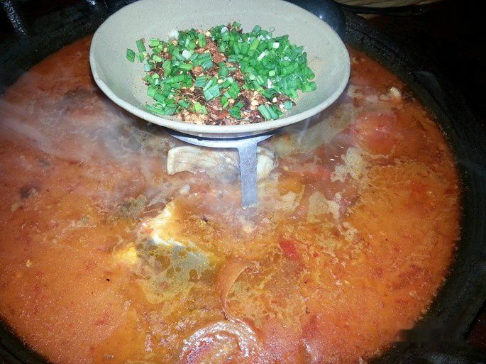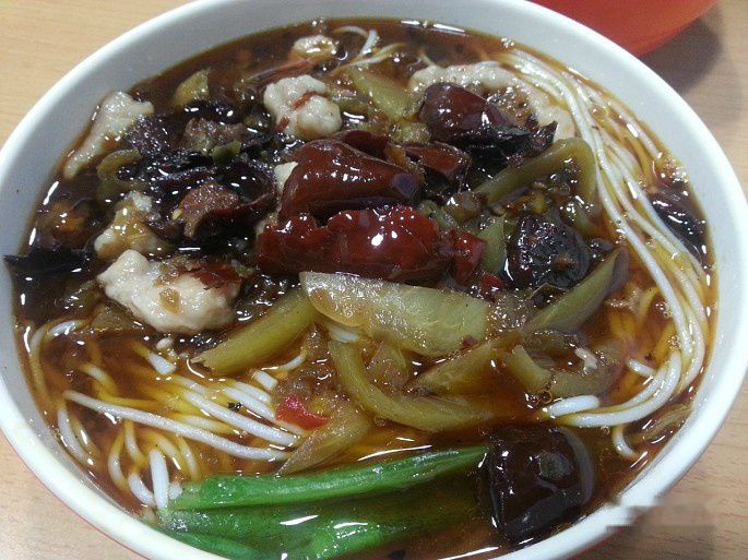 镇远的酸汤有多种,最常见的便是白酸、红酸和辣椒酸。白酸是用米汤发酵而成,红酸是当地的野生西红柿腌制而成,而辣椒酸则是糟辣椒炮制而成。三种酸味各领风骚,天然浑成,色泽从米白、红渐成耀眼的大红,味道鲜美。点餐的时候,服务员问你要什么汤的时候,你就可心中有数了!