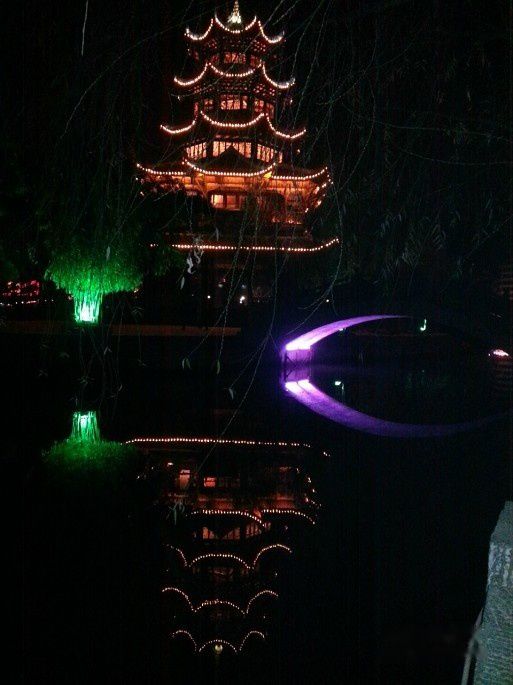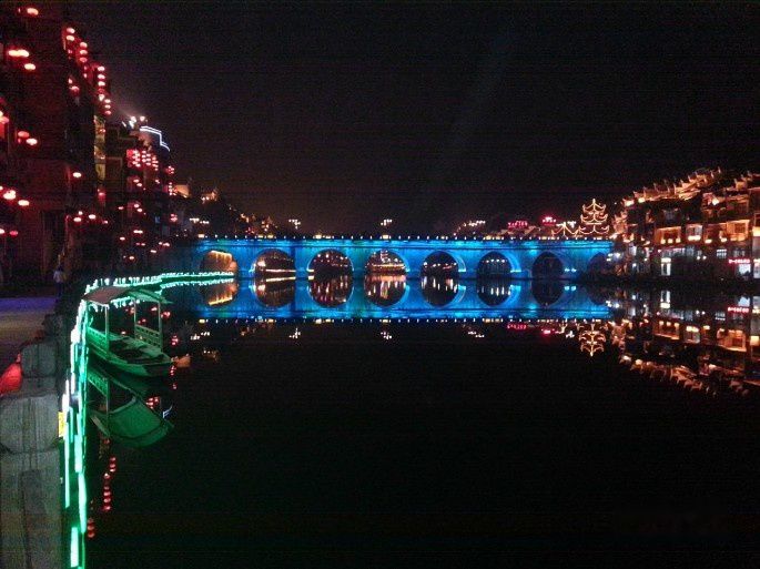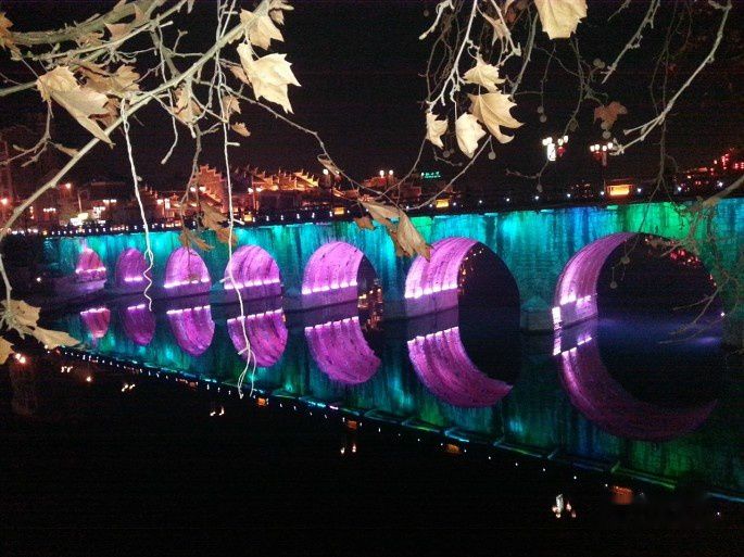 大新桥上的彩虹灯与两岸的灯光交辉相映于清澈的河水中,非常的漂亮。