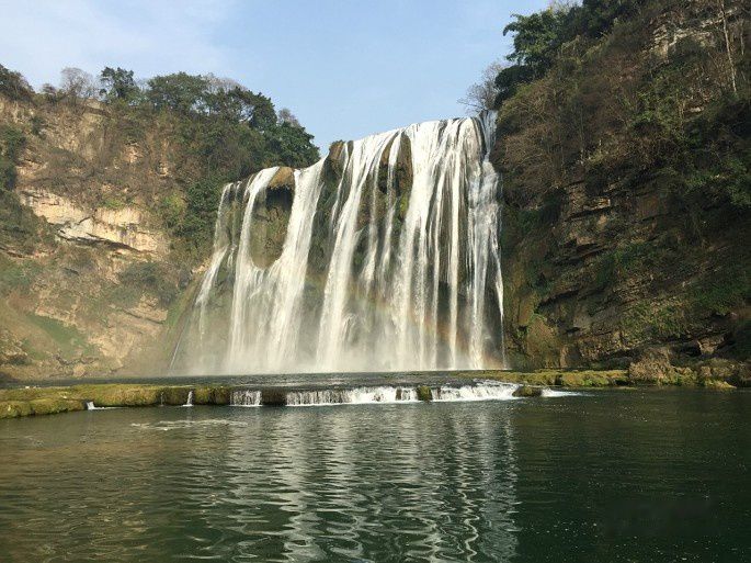 冬日里的黄果树瀑布,虽然没有往日的雄壮气势,但还是挺秀气的!在微弱的阳光下,彩虹妹妹还是害羞地露面了!据说:安顺在我们未到达的前几天还是阴雨天气,而我们到来那天确实阳光灿烂了。