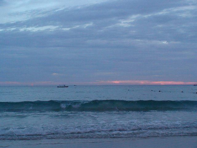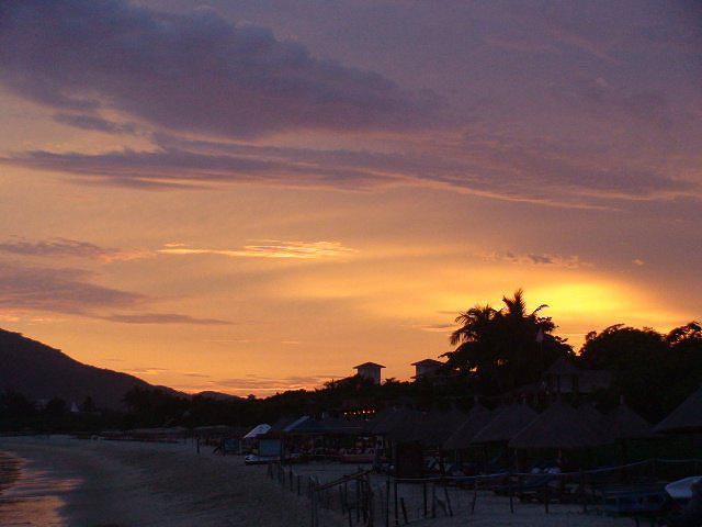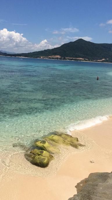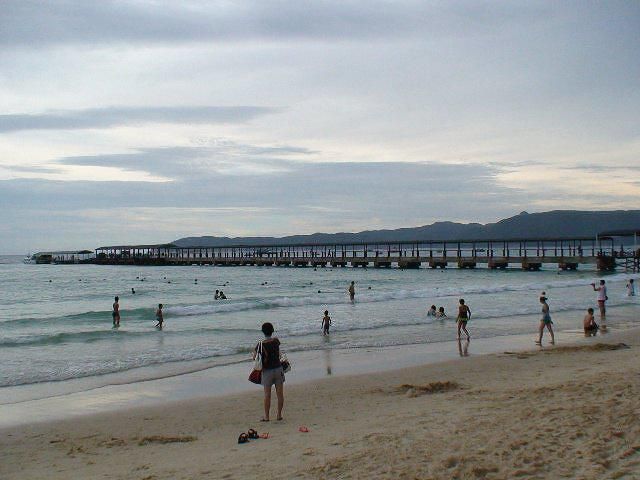 吃过早餐就去大东海潜水。以后记住去潜水时,除了泳衣什么都不要带,完全没必要,反而还要租保密柜。说是潜水30分钟,但是我估计在水中的时间有没有20分钟都成问题。潜水前会先换好泳衣,陆上教练教潜水常识:包括向上(拇指向上)、向下(拇指向上)、不能摸(拳头)、感觉不舒服四种手势(张开五指左右摇晃),且由于潜水教练在客户左侧,所以需要用左手指示;在水中用嘴呼吸,深吸慢呼,这样做的原因就是使用氧气瓶中的氧容易导致喉咙干涩;还花20元买了一个呼吸嘴,真贵呀,估计商店里只卖2元,以后谁要去就别买了,别听他瞎忽悠什么讲卫生。这时我发现我的潜水服脚上那部分并不像往常照片中看到的那样,是鸭脚鞋,原来鸭脚鞋是给潜水教练穿的,我穿的只是普通保护脚免被刮伤的鞋,看着这土鞋,潜水的兴致就去了一半了。陆上简介完成后,就坐电瓶车到潜水码头,乘船到潜水区(离岸边不远,别怕)。先在潜水区的泊船上休息一下,看看周围充满健康肤色的潜水教练。轮到我了,腰上挂着很重的铁链,说是用来下沉,但是据我游泳的经验,不会游泳的人不挂铁链也会自动下沉。潜水教练先穿戴好自身的氧气瓶和眼罩,带上我的氧气瓶和眼罩下水,我看见他背上还有一个矿泉水瓶,里面有些黄色颗粒状物体,此时我不知道是什么,干嘛用。氧气瓶很重的,但是放在海水中就可以自己浮起来,所以教练拿着也不费力,我下水后帮我穿戴好。第一个问题就是“会游泳吗?”,答“会”,说明“水里你就别自己游了,我带着你游,我会带着你去看,或者你指示我你想去哪个方向,当然,不是所有的地方都能去。鱼可以随便抓,但是珊瑚不能随便碰,我会指示你哪些珊瑚能摸”,然后又把陆上教练教的重复了一遍。开始戴眼罩含呼吸嘴,头埋在水中适应呼吸,自觉可以后,就下潜了。第一次下去,我听到耳朵里咕咕咕响,以为是什么地方没有穿戴好,指示教练上浮,出水后教练问我干嘛起来,我说听到响声以为哪里没搞好。教练说正常,如果有问题,我会自动带你上浮。这下放心了,下去就没起来,越来越深,有的地方就像海沟一样,感觉还有些害怕,耳朵由于压力的缘故也开始隐隐着痛,痛就痛呗,捏着鼻子向耳朵里鼓气,舍不得起来呀。眼前好多漂亮的海鱼,爽死我了,就是抓不着,这时我看到眼前有些黄色的颗粒出现,这下明白教练背上的矿泉水瓶是干嘛用的了,鱼食,诱鱼的,不要把鲨鱼诱来就行。还有各种各样的珊瑚,有的珊瑚有点像电影里的异型,摸着滑溜溜的,感觉不好,有些害怕,万一真是个异型,一张嘴不就把我摸了。我还犯了一个错误,摸一个珊瑚时没有感觉,一使劲,被我从岩石上摸下来了,虽然只有一小部分与岩石分离并且没有与其他部分脱落,但是我还是觉得不好,别人辛辛苦苦长了这么长时间,我一下子就搞掉了,对不起对不起!教练专门把我带去看估计是夫妻同潜水中拍照,意思是让我也拍呗。我是想拍,但是我一看那两个人,穿着潜水服,根本就看不出来谁是谁,没意思,算了!还没尽兴呢,上浮了。