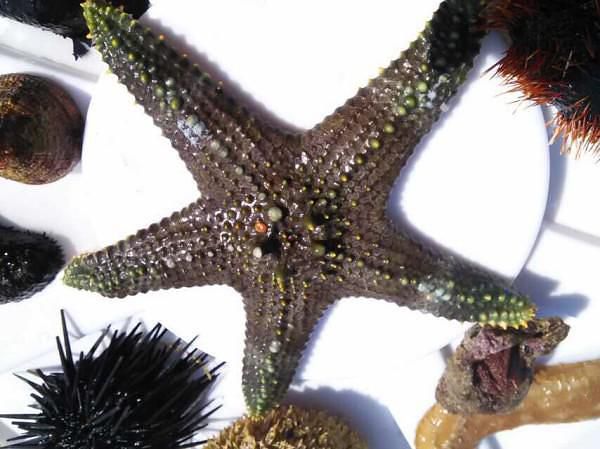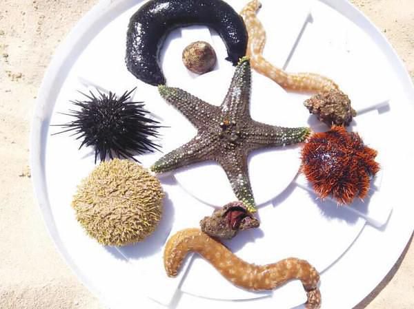 黑色长条状的是海参黄色的是它的兄弟刺参。黑色圆形带刺的是海胆黄色跟红色的是它远方的亲戚 .中间的大家都很爱国吧,五角海星。剩下的是贝壳啦。