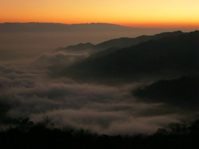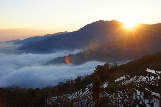 由于元阳的立体气候突出,巨量水蒸汽随着热气团层层上升,形成了元阳半山地区终年大雾笼罩,云海格外神奇壮丽的原因。太阳快要出来了,云海变得扑朔迷离,边缘呈现出迷人的金色。