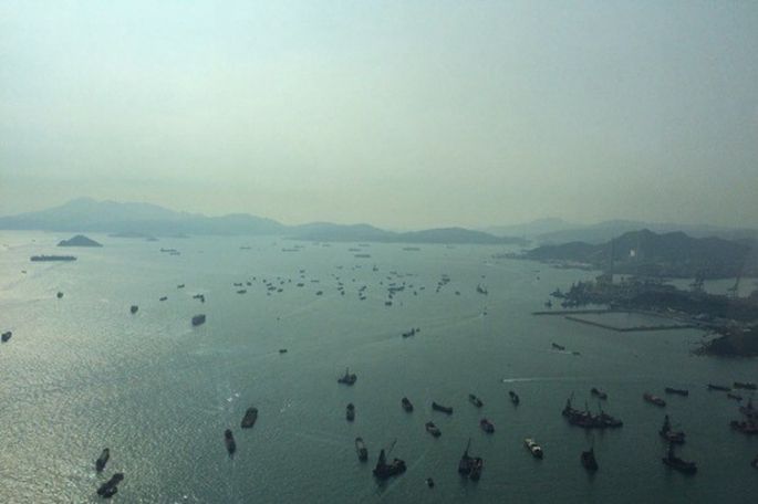 向南看,是经济命脉港岛中环的璀璨灯光与晚霞