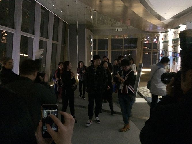 本来看完日落我们就打算走了,要去铜锣湾吃避风塘炒蟹。就在我们准备离开的时候,来了一个戴着帽子的黑衣人,被簇拥在人群中。我俩都觉得他的身影特别眼熟,凑过去仔细看,惊喜发现是大明星——徐峥!