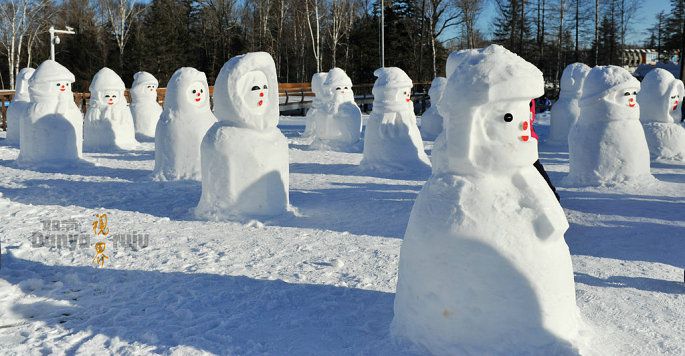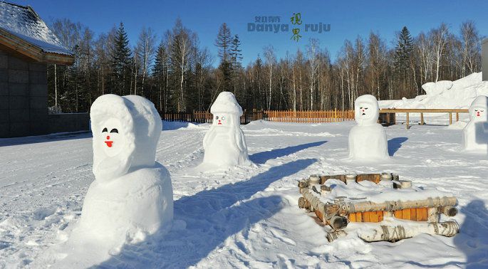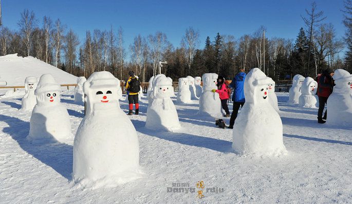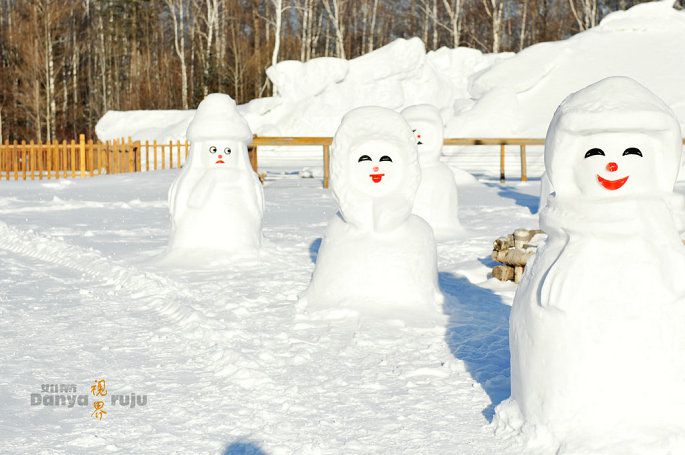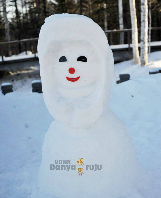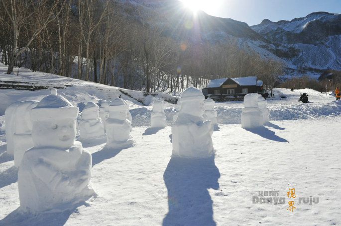 在景区内辗转于长白山各个有名的景地,在瀑布山脚下,再见就地取材的雪娃娃。