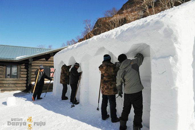 有工作人员在建冰雪景观。可以把雪块随心所欲像水泥一样来用,对我来说很觉着稀奇。