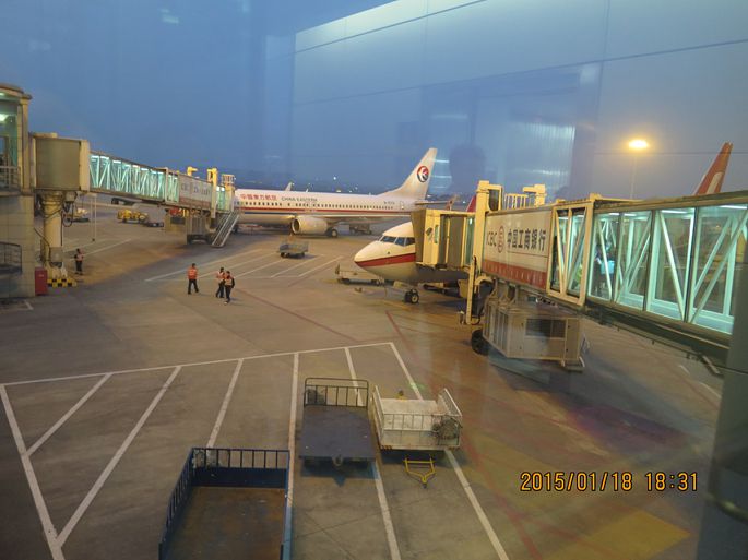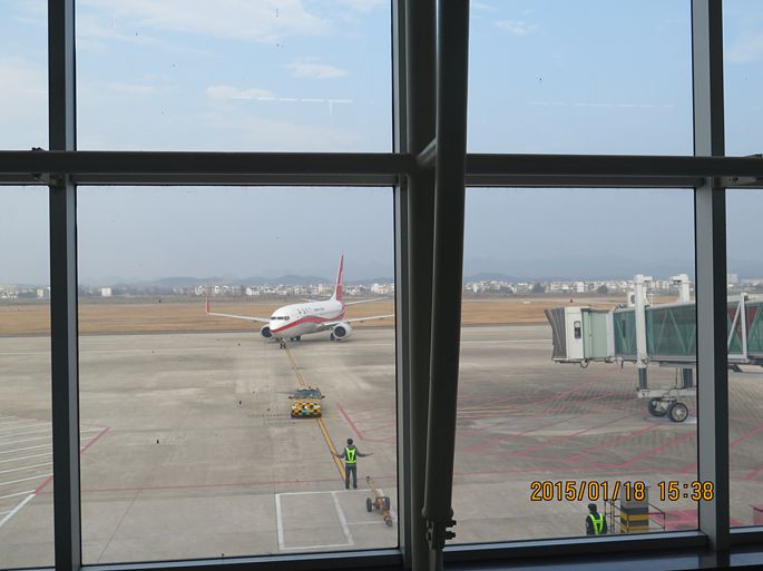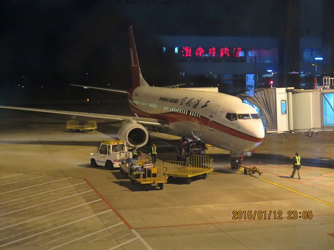 第一天,1月12日下午,江油14:54乘C6305动车16:37直达成都双流机场。晚上20:30在双流机场T2乘上海航空FM9266航班,23:00到达黄山屯溪机场。酒店承诺的接机,因航班晚点近1小时而取消,只好打的前往7天酒店黄山老街店。