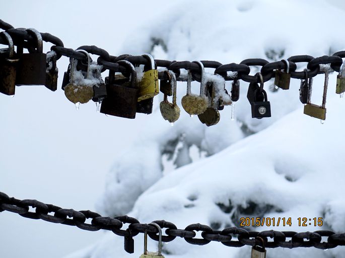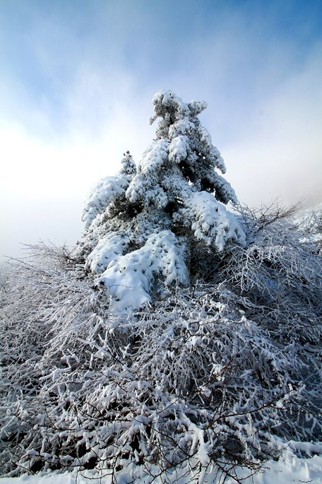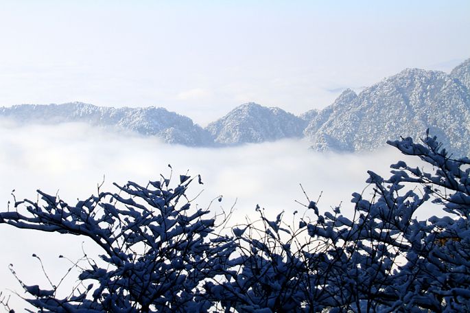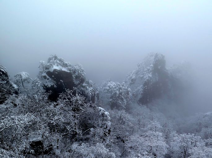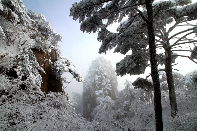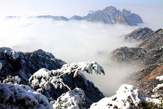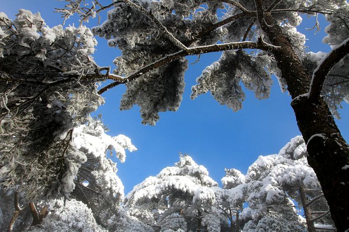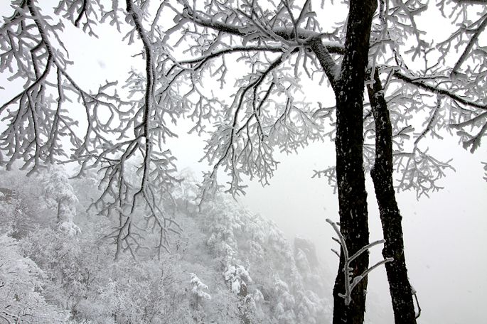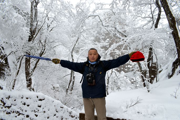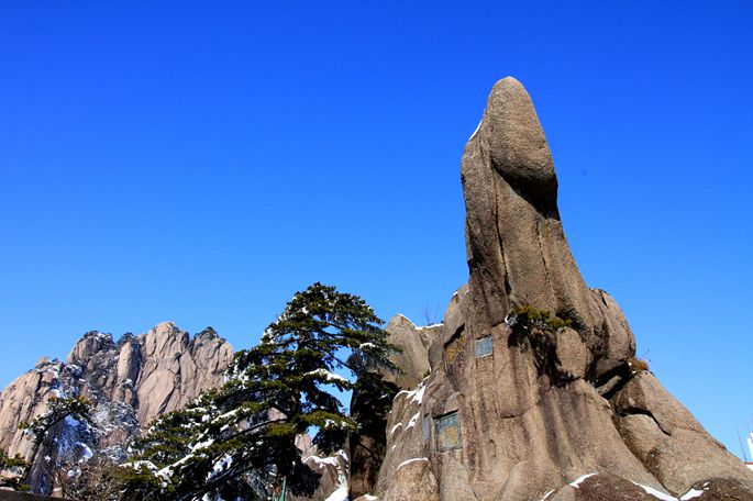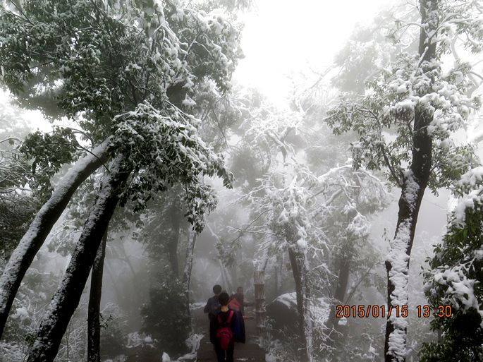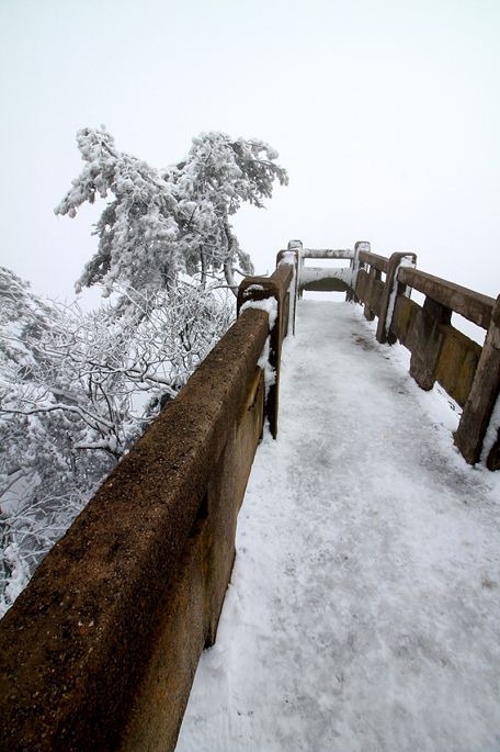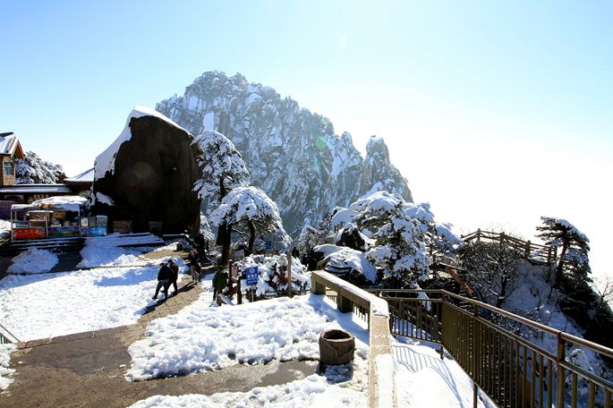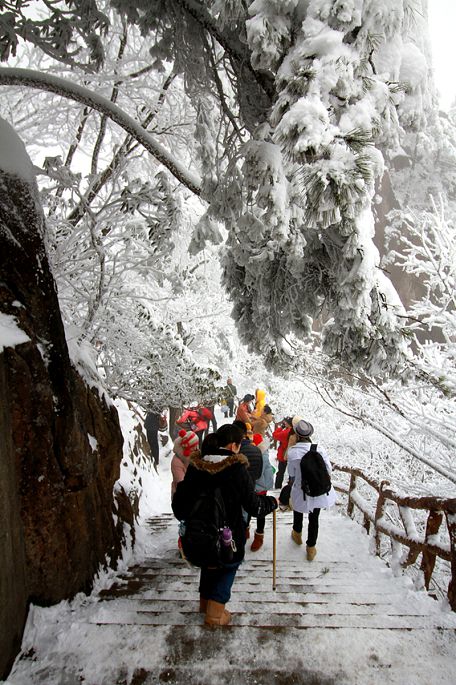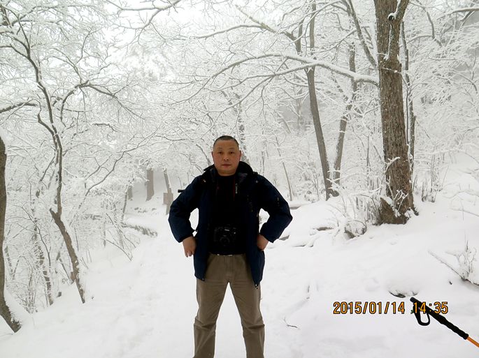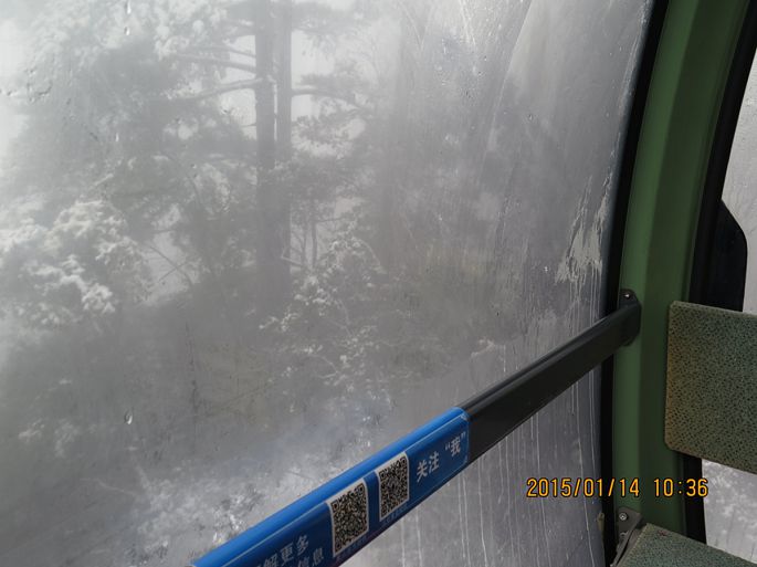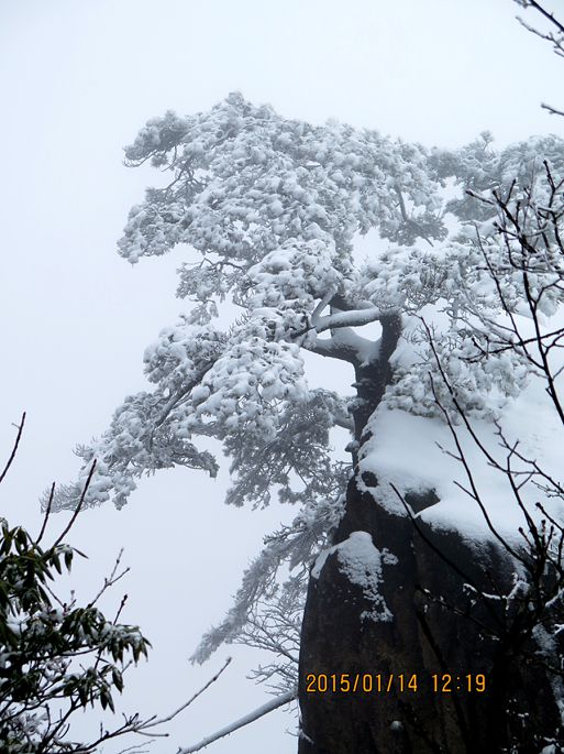 第三天,1月14日,从网上新闻获悉,黄山昨天下了2015年第一场大雪,我们本就是奔黄山雪景而来,真是天赐良机,大喜过望。6点过就早早出门,打的来到汽车站,想早点上山,结果因是旅游淡季,并不按时发车,而是坐满才走。直到7点40车才出站,8点50中巴到达 黄山景区东岭换乘站。等候换乘景区大巴,,经过20分钟车程到达云谷索道,黄山对省摄协会员也是门票索道票尽免,凭会员证一路畅行,又省了一笔银子。,坐10分钟索道,上到了白鹅岭,踏出索道口,只见黄山被大雪盖了一个严严实实!所有游人都被眼前的美景惊喜得手舞足蹈、童心大发。由于要在山上住宿,所以背负了全部行李,漫步在满天飞雪和银装素裹的山野小道上,兴奋和激动使脚步变得不那么沉重,,一路拍照一路观景,由于没有阳光,雾气笼罩,所到景点只能看见树上和地上厚厚的雪,看见路边的提示牌写着始信峰、清凉台、狮子峰...下午3点40来到了预定的白云宾馆,泡个方便面,洗漱—番,龟缩在酒店休息。