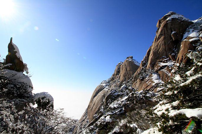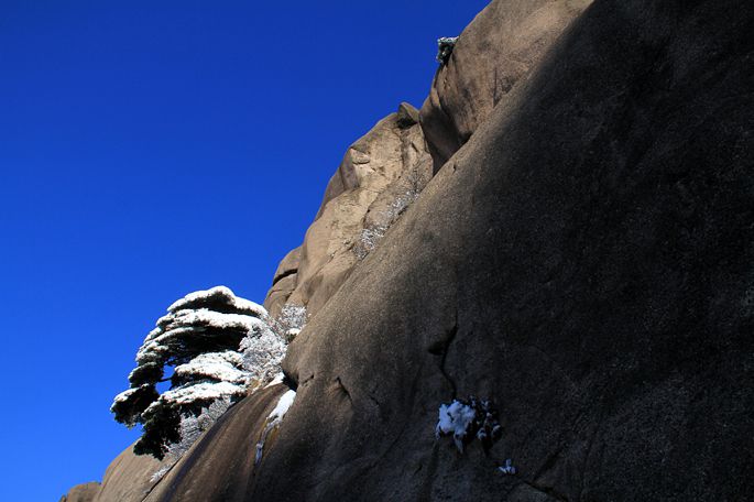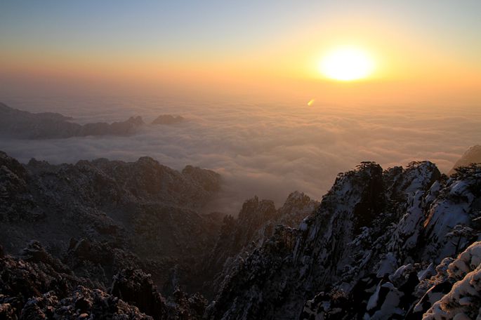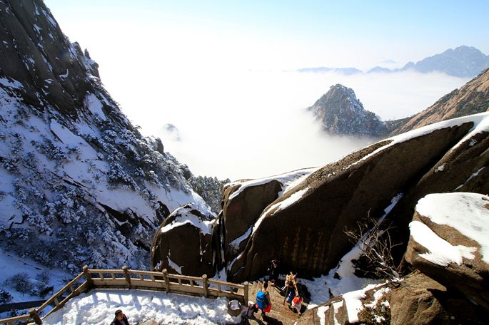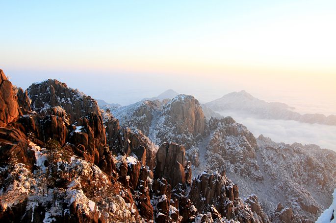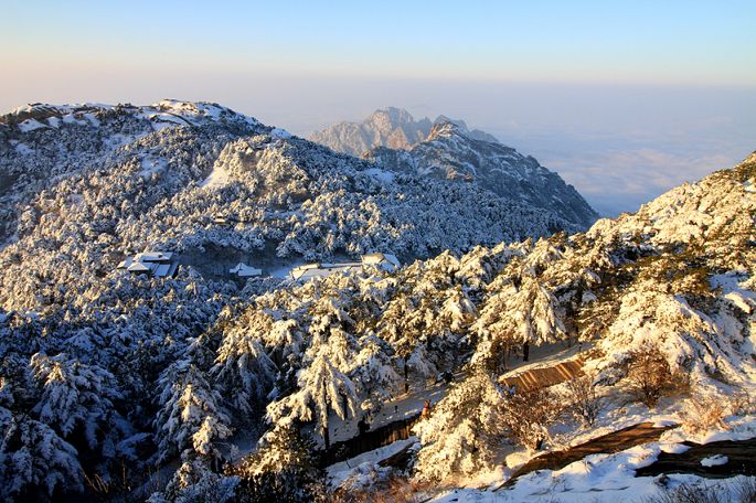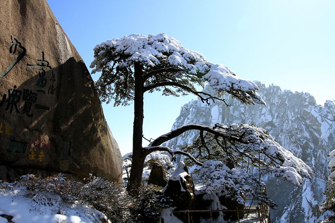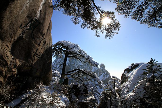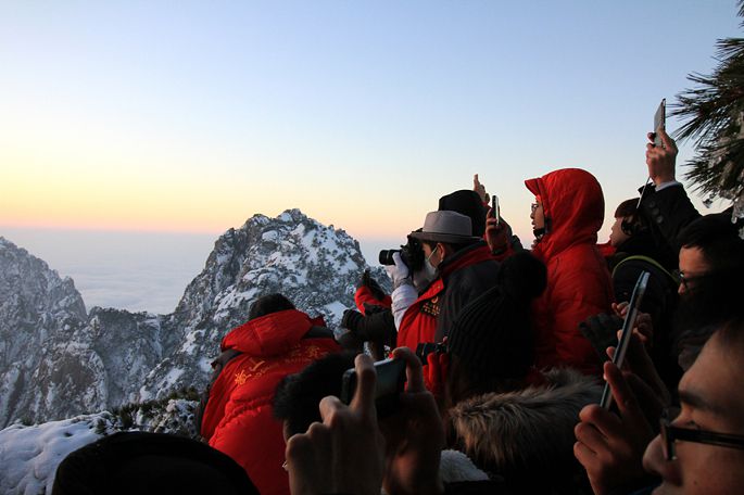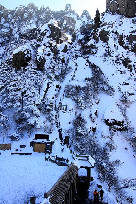 第四天,1月15日,凌晨6点起床,站在酒店阳台仰望天空,只见满天星月,料知今天一定是个晴好天气,于是拿上相机,爬了20分钟,于6点30来到光明顶,等待东方日出。虽然游人不多,但大家都想占据有利地势,地上的冰雪湿滑,让我难觅最佳观赏地。7点过几分,东方的天际越来越红,一轮金红色的太阳从云海上徐徐升起,顿时,万道霞光洒满群峰,翻滚的云海金波荡扬,松枝上的白雪仿佛也变成了多彩的玛瑙...。在山顶呆了1个多小时才不舍的离开,回到酒店,泡了方便面,收拾好行囊退房。由于冬季,景区关闭了西海大峡谷、莲花峰和天都峰等景点,关闭了太平索道和下山的玉屏索道,所以今天别无选择,只能途经海心亭、鳌魚洞、百步云梯、迎客松、一线天、半山寺等景点步行下山至慈光阁。起初由于风和日丽,云海奇峰、冰雪玉树,让人美不胜收,目不暇接,倒还走得轻松自在,但无休止的石梯,加之冰雪湿滑,让人欲快不能,欲慢不行。下山的脚步变得越来越艰辛。在迎客松景点我休息了50分钟,吃了一点干粮。随后的下山路程,,腿和足都越来越不听使唤,特别是下午1点左右,天空渐渐暗了下来,穿行在雾气笼罩和冰雪消融的云梯之中,雾气、汗水和雪水把厚重的冬装也湿了个透。终于在下午2点半,走到了慈光阁。在慈光阁门前景区换乘中心乘车到终点站--寨西换乘中心。下车后赶上了13:40到黟县的班车,原计划去宏村,但司机说这班车只能经过西递,于是决定改住西递。下午4点20车到西递,***票处一打听,摄协会员仍免门票,巴适,于是大摇大摆进了村。村中一老妇,一直尾随我俩,一边介绍她家客栈,一边介绍西递历史,身背沉重的行囊,实在想尽快安顿休息,于是随她来到了村中临溪客栈,与老板娘一阵讨价还价,决定就住此地。,本想晚上叫老板好好弄几个菜,喝点小酒犒劳一下自己,结果弄出来的菜实在没有水准,用汤泡饭勉强填饱了肚皮,老板娘不客气的收了90元餐费。我们节约了门票钱却被老板娘宰了一刀,够狠!
