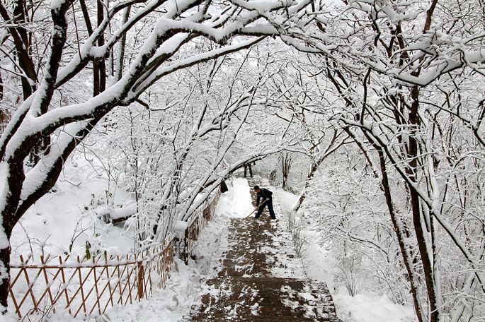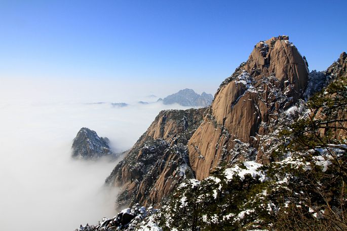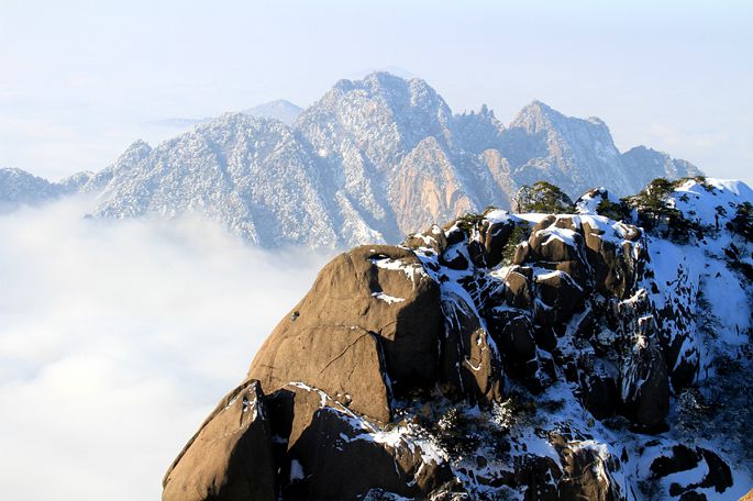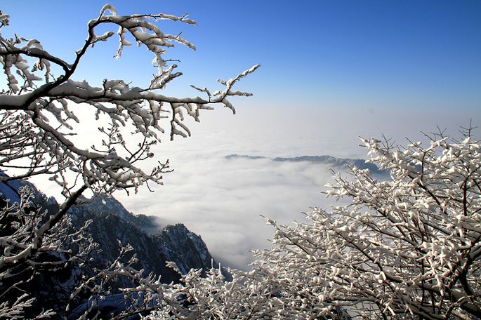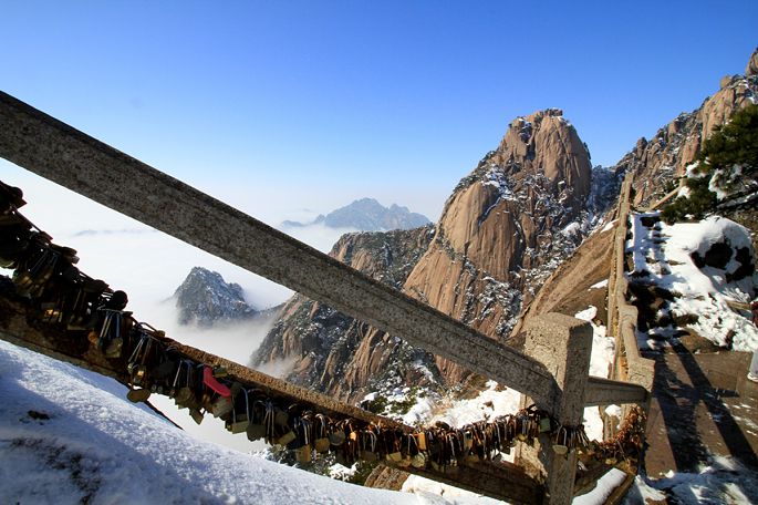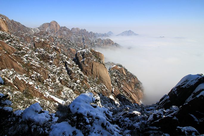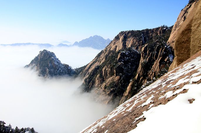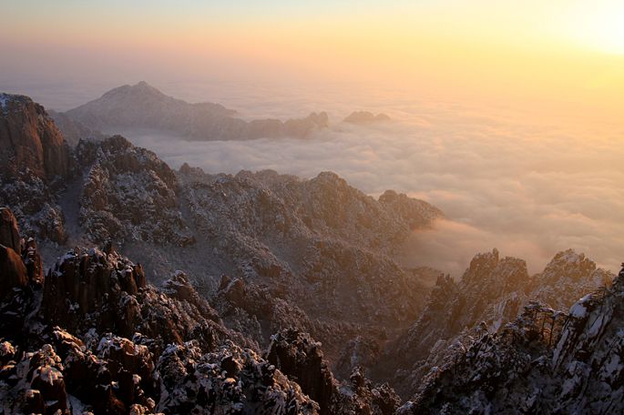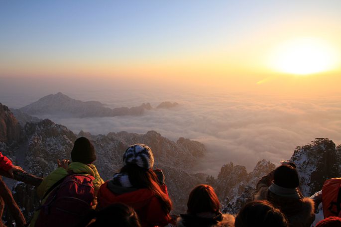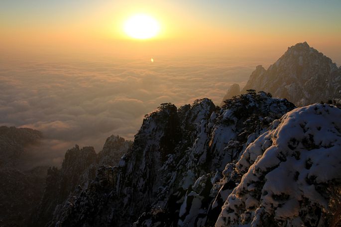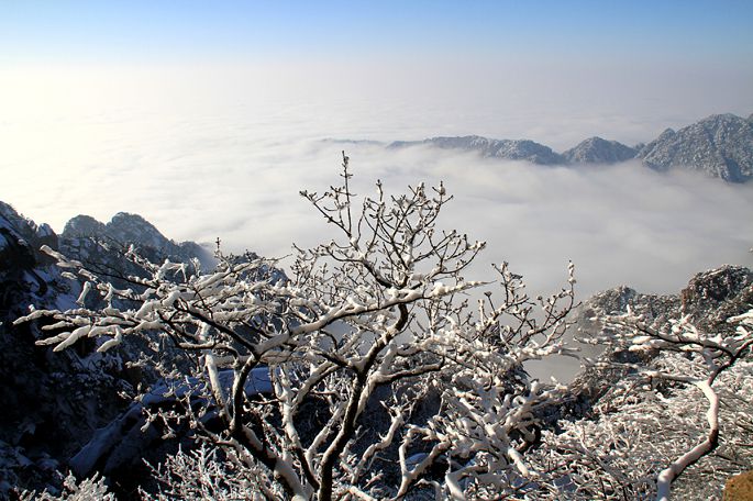 第四天,1月15日,凌晨6点起床,站在酒店阳台仰望天空,只见满天星月,料知今天一定是个晴好天气,于是拿上相机,爬了20分钟,于6点30来到光明顶,等待东方日出。虽然游人不多,但大家都想占据有利地势,地上的冰雪湿滑,让我难觅最佳观赏地。7点过几分,东方的天际越来越红,一轮金红色的太阳从云海上徐徐升起,顿时,万道霞光洒满群峰,翻滚的云海金波荡扬,松枝上的白雪仿佛也变成了多彩的玛瑙...。在山顶呆了1个多小时才不舍的离开,回到酒店,泡了方便面,收拾好行囊退房。由于冬季,景区关闭了西海大峡谷、莲花峰和天都峰等景点,关闭了太平索道和下山的玉屏索道,所以今天别无选择,只能途经海心亭、鳌魚洞、百步云梯、迎客松、一线天、半山寺等景点步行下山至慈光阁。起初由于风和日丽,云海奇峰、冰雪玉树,让人美不胜收,目不暇接,倒还走得轻松自在,但无休止的石梯,加之冰雪湿滑,让人欲快不能,欲慢不行。下山的脚步变得越来越艰辛。在迎客松景点我休息了50分钟,吃了一点干粮。随后的下山路程,,腿和足都越来越不听使唤,特别是下午1点左右,天空渐渐暗了下来,穿行在雾气笼罩和冰雪消融的云梯之中,雾气、汗水和雪水把厚重的冬装也湿了个透。终于在下午2点半,走到了慈光阁。在慈光阁门前景区换乘中心乘车到终点站--寨西换乘中心。下车后赶上了13:40到黟县的班车,原计划去宏村,但司机说这班车只能经过西递,于是决定改住西递。下午4点20车到西递,***票处一打听,摄协会员仍免门票,巴适,于是大摇大摆进了村。村中一老妇,一直尾随我俩,一边介绍她家客栈,一边介绍西递历史,身背沉重的行囊,实在想尽快安顿休息,于是随她来到了村中临溪客栈,与老板娘一阵讨价还价,决定就住此地。,本想晚上叫老板好好弄几个菜,喝点小酒犒劳一下自己,结果弄出来的菜实在没有水准,用汤泡饭勉强填饱了肚皮,老板娘不客气的收了90元餐费。我们节约了门票钱却被老板娘宰了一刀,够狠!