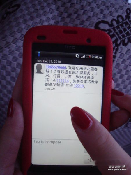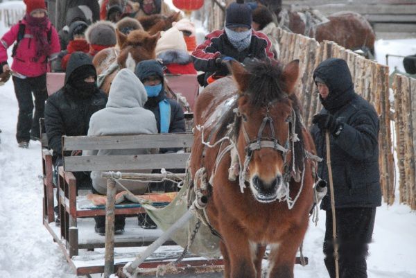 清晨六点半,福顺天天的morning call准时响起。我立马起床简单收拾好行李到楼下办理check out,因为今晚要在雪乡住一晚,这里必须退房。早餐已经打包到了前台,打开来瞅了一眼,营养够了却没胃口。酸奶一杯+冷餐包两个+苹果一个+桔子一个+香蕉一个,大冷天的,真想喝一碗热腾腾的白米粥,感觉眼前的食物看得我胃里打哆嗦,可为了今天的长途跋涉硬着头皮也得吃啊。旅行社手机短信通知我,七点准备来接我,可七点二十分才来,原来是堵车了。来接我的是一辆金杯车,我立刻意识到这是专程接我,然后转大巴的。车行至天竹宾馆,发现五六辆大巴已经马达轰轰的候着了。天竹宾馆是哈尔滨一个比较大的旅游集散地,我们很幸运直接找到了“批发商”,所以拿到了好价格。从我们后来车上了解的情况,再次证明我们拿到的price相当棒。我顺利与Fiona还有Martin会合了,大家兴致勃勃地上了指定的大巴,车上早到的驴子们把有利的位子都给占了,我们只能坐到了中间偏后的位置。大约八点半我们的大巴终于发动了,导游叫马玲,一位24岁的哈尔滨姑娘,口齿伶俐,性格豪爽,一路上旅行常识,雪乡概况,衣食住行来了通“大贯口”。我们的二百六十公里路程需要六个多小时,中途只有一次山河镇休息“唱歌”(入厕),男士回归自然,女士排队找位。为的就是抓紧时间赶路,让大家早日见到梦想中的雪乡。
