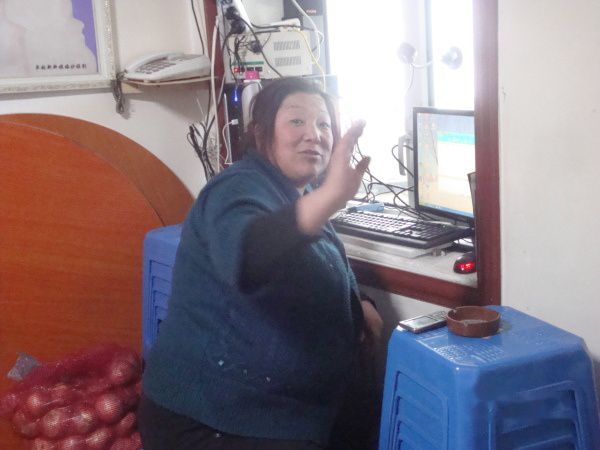 收拾好行囊,出房间转转,看见了传说中的胖姐,木屋的主人,一位身材肥硕,皮肤黝黑的东北大嫂。一张乐呵呵的脸亲切得很,她正在电脑前忙碌地联系生意,这可是“九月磨刀,三月宰客”的季节啊。