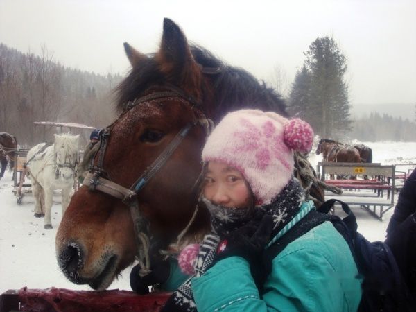 少时休息,马导就召集大伙儿出门开始我们的马拉爬犁之旅。这一趟马拉爬犁价格可不菲啊,120/人,但坐上去立马欢心鼓舞。一车六人,我们占了头一辆。当浩浩荡荡的马队行走在雪乡中,雪花飞舞,马蹄嘟嘟,马鞭啪啪。沿途小屋炊烟袅袅,在白茫茫的飘雪的映衬下,象极了梦幻世界。