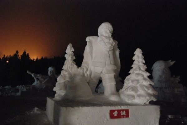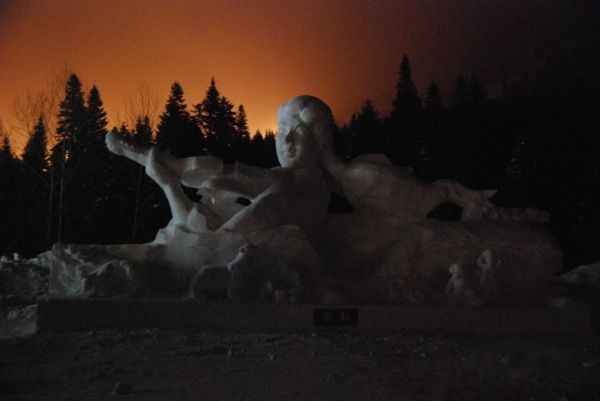 就在雪韵大街的尽头,我们发现了几尊非常精美的雪雕作品。也算弥补了我们没时间看雪博会的遗憾了。不远处有烟火绽放,在烟火的映衬下,雪雕更美了。