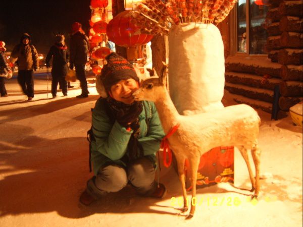 皎洁的月光下,小木屋透出橘红色的灯光,脚踩在冰雪上发出的“喀嗤喀嗤”的响声,远处不时传来东北二人转的歌声,我们为了照顾Martin没有去观看。但在雪韵大街上,我们发现了很多乐趣。