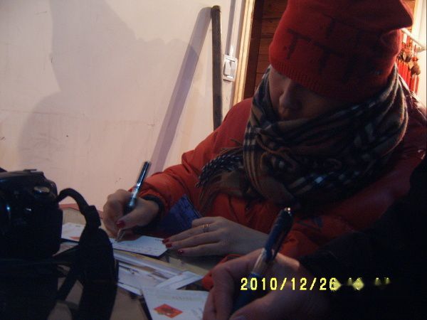 的确,在这样童话般的小山村,为远方的亲友送上一份冰清玉洁的祝福,是多么美好的一件事情!这里的明信片是套装,一套十一张雪乡风光含八毛钱邮资二十八元。我们立马拿了一套,Fiona和我各分了五张,Martin只要了一张送给他的家人。我和Fiona坐定,非常虔诚地写着每一张明信片,一字一句里饱含了许多的思念,祝福和期许。