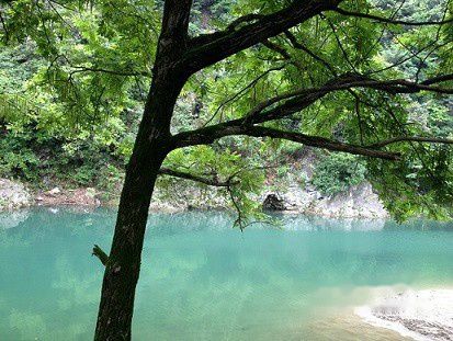 河畔的古树枝流叶布,苍翠欲滴,像沐浴后的少女,亭亭玉立