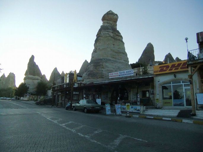 路边这些烟囱般的岩石都被开凿成一家家酒店
