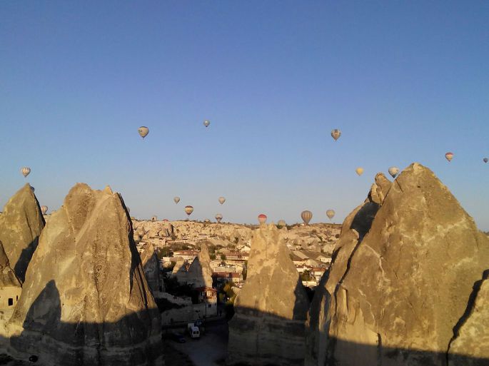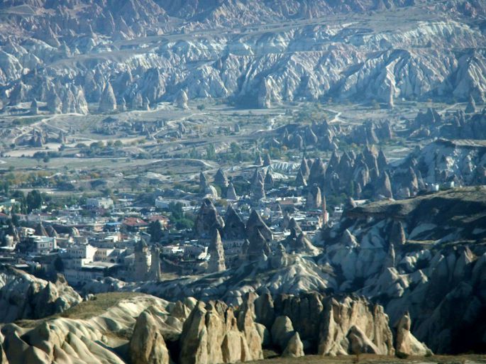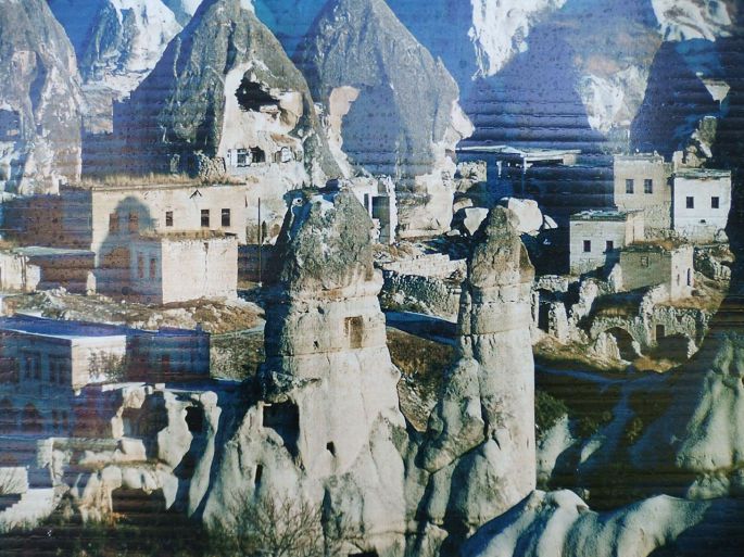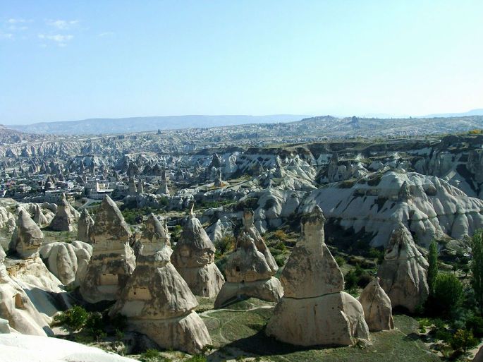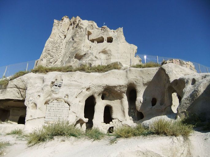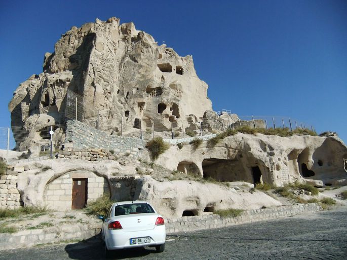 乌其希萨尔城堡是六十米高的巨大岩石,它像一件现代主义的艺术品,数个圆锥型的巨岩被早期的定居者挖空建成要塞,相连形成庞大社区,巨岩上有数不清的洞口,外敌入侵时,平时就在洞穴社区存好水粮的居民,可以躲上数月不必外出。