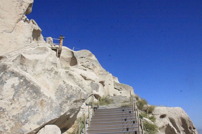 在岩洞下面有小门,从这个小门可以进入这个巨大的天然堡垒,穿过洞塔可以登上乌其希萨尔的山顶。于是我们进了这个小门,