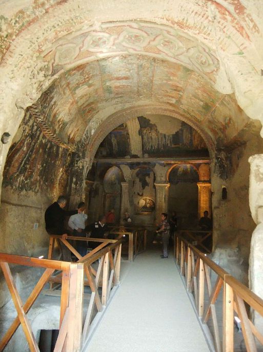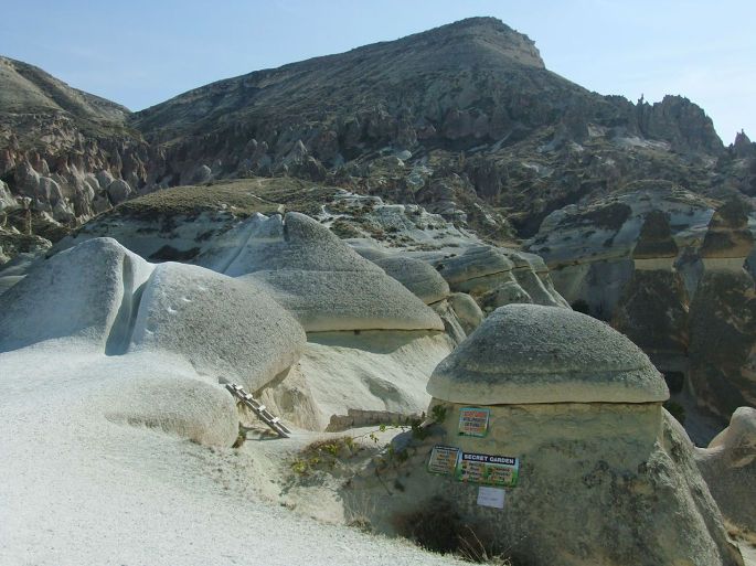 露天博物馆里,遍地都是这种火山喷发时岩浆在石灰岩地表上留下的一个个独立的小山峰。它们可高达数十米,呈圆锥形,锥顶的石头硬度非常高,越往下硬度越低。所以古人会把这些山峰内部挖空,变成几层具有各种功能的住房或宗教建筑。这种小山峰,远近高低各不同,被后来的人取名Peribacalar,中文是仙人烟囱。露天博物馆是个建筑群,里面包括拜占庭时期的教堂、礼拜堂和修道院,从外表是看不出来区别的。