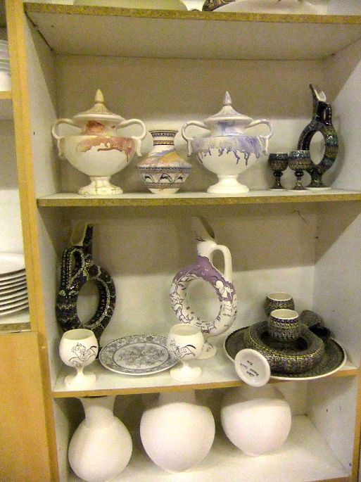 我们在这里参观了制陶的全过程,最后几间屋子摆满了出售的商品:各式各样的陶瓷工艺品摆在货架上、桌子上,流光溢彩,琳琅满目,我们不禁啧啧赞叹。但这里是禁止照相的,我们只好收起相机。敏在这儿花80里拉买了一套磁盘。