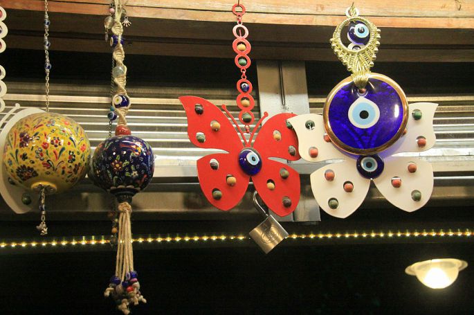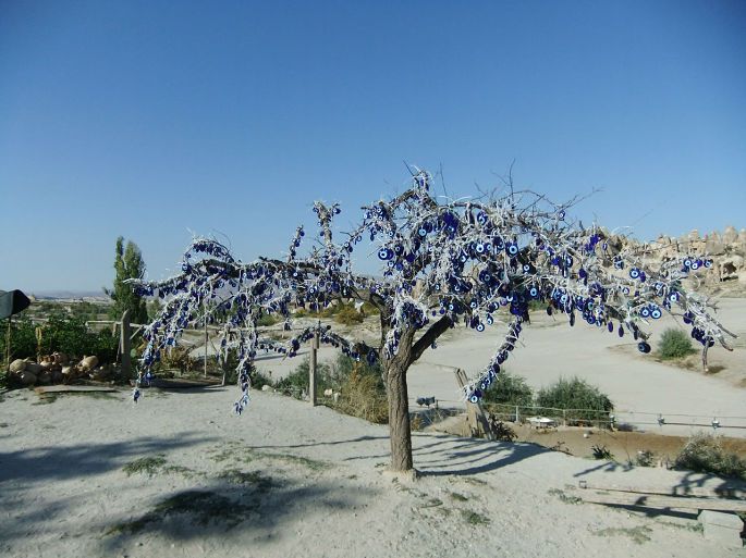 这种图案到处可见,钥匙链、杯子、项链、盘子、图画、明信片,连墙壁上都画着蓝眼睛,土耳其人说这种图案可以趋邪避灾。当今,“蓝眼睛已经和土耳其人的生活密不可分了,他们不仅在婚礼葬礼上悬挂蓝眼睛,一求神灵的庇护。就是平时,也将小点儿的蓝眼睛放在胸前口袋里。而这满树的蓝眼睛不知会给主人带来多少福祉,为此我们也要去沾沾光