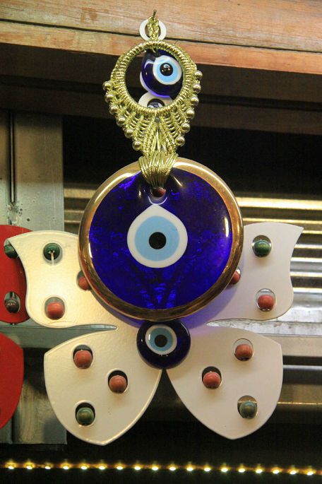 土耳其,在一切出售旅游商品的地方,看得最多的工艺品就是土耳其蓝眼睛。那图案是在蓝底上加一个白环,中间再点一个蓝点,很像一只睁得圆圆的大眼睛。