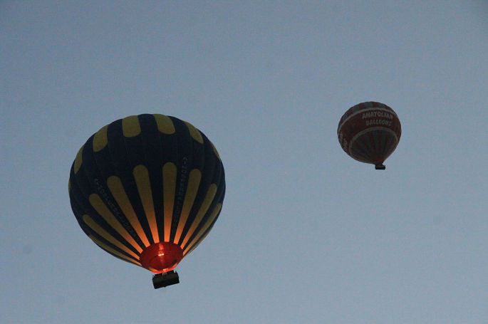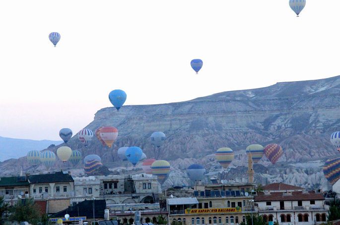 终于在镇子的东头,找到一家酒店的小山包,我爬了上去,此时更多的热气球从基地争先恐后地点燃升起