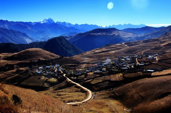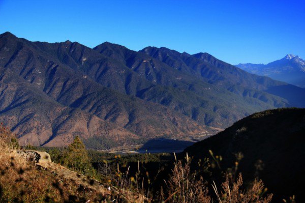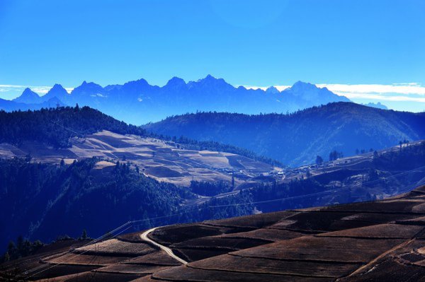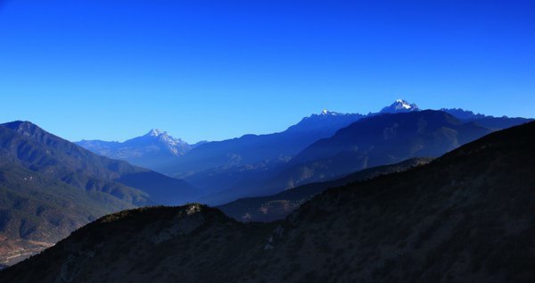 出发后不久,车在雄古台停留,下车看了看山峦重叠的远方。那是玉龙雪山的背影,此时离我渐行渐远。