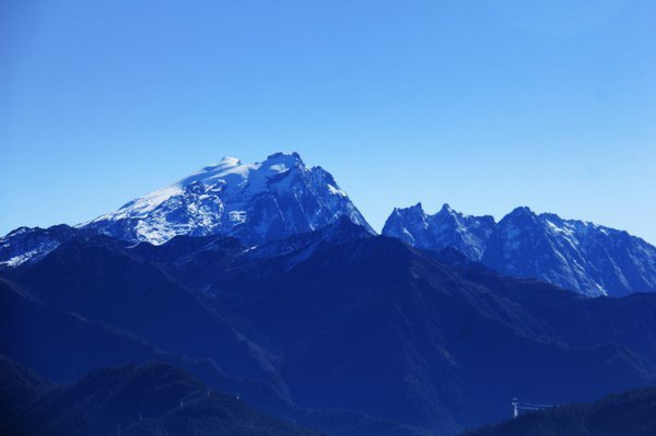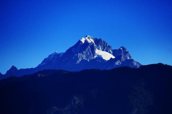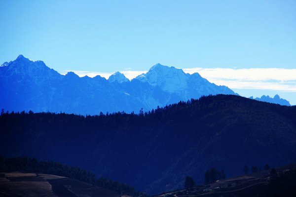 站在哈巴雪山脚下看远山峦叠,巍峨绵长的起伏线像神的轮廓若隐若现