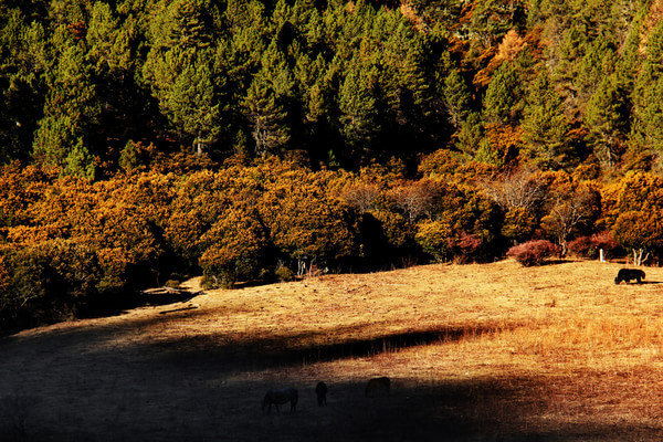 阳光偷偷溜走前的几处暖地,牦牛和高原马匹自顾吃草,对他们来说,此处祥和静谧,离天堂很近