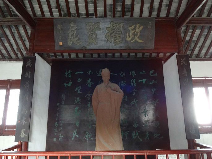 来到主室,门庭“陋室”二字为诗人臧克家所题。陋室正厅塑刘禹锡全自站像,上悬“政擢贤良”横匾,两旁木柱上有“沉舟侧畔千帆过,病树前头万木春”楹联。