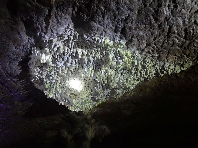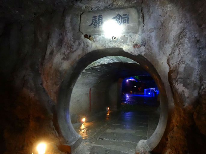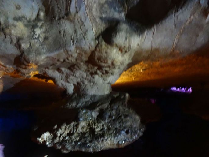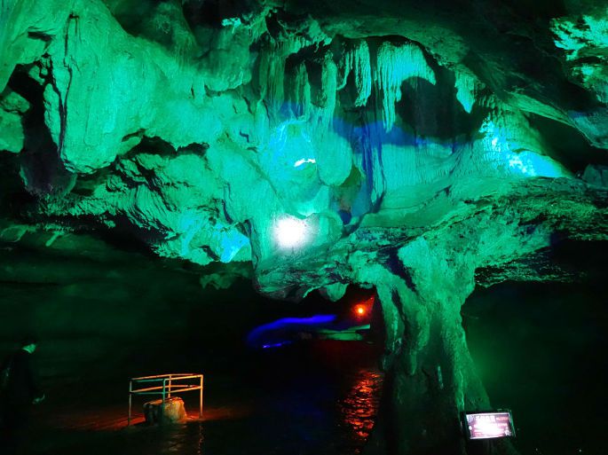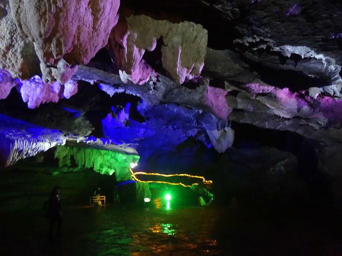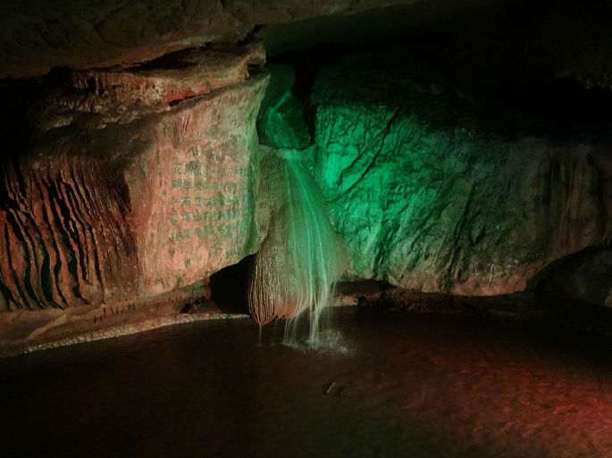 洞内,气象万千,光怪陆离。进口大厅约有1600平方米,高5至10米,可容千人。旱洞景观瑰丽,钟乳奇石,如莲、如笋、如柱、如花、如幔,如兽、如人,如钟、如鼓、如棋、如桌、、、、、鬼斧神工,令人叹为观止。水洞高峰出谷,瀑布流泉,长达2公里多,行舟可达700多米,跌宕起伏,任意东西。
