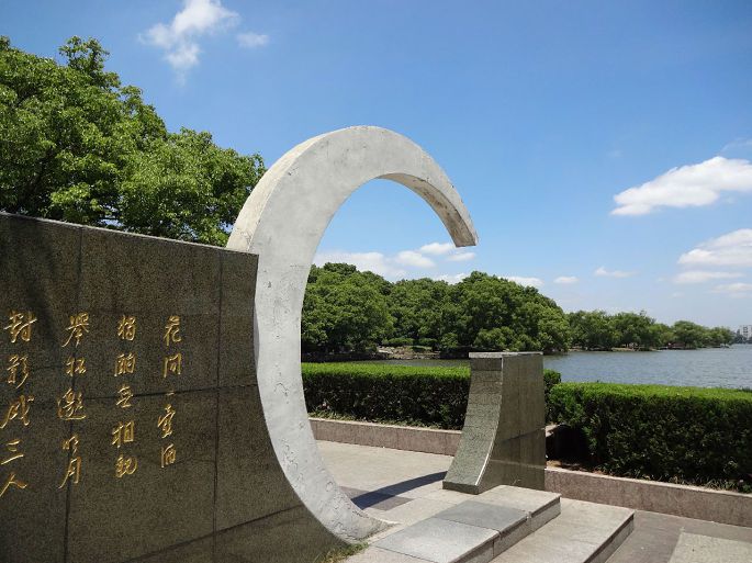 如今,马鞍山市区主要街道路旁,建造了不少关乎李白诗文的人造景观。这是雨山湖畔的一座雕塑,濒湖而立,状如弯月,与《月下独酌》的碑刻连成一体,背面则是李白的画像,艺术地表现了“举杯邀明月”的意境。