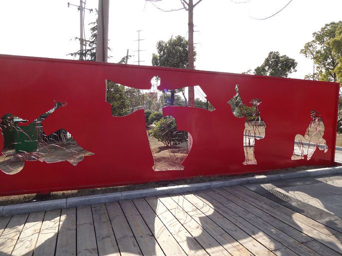 这是市文化广场附近的一个造型,一块通红的长方型铁皮竖在路边,镂空处勾勒出李白四种不同的姿态,形象逼真,惟妙惟肖,在夕阳的辉映下栩栩如生,斑驳陆离,令人浮想联翩。