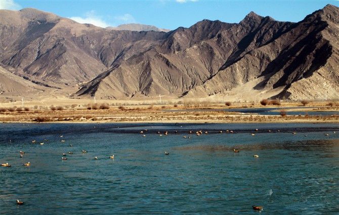 在机场旁坐中巴车去市区,很方便。一路上见到公路旁的雅鲁藏布江,蓝色的水面上成群的野鸭子在嬉戏,很震撼。冬天,这里是野鸟的天堂,这是其他季节来看不到的美景啊。