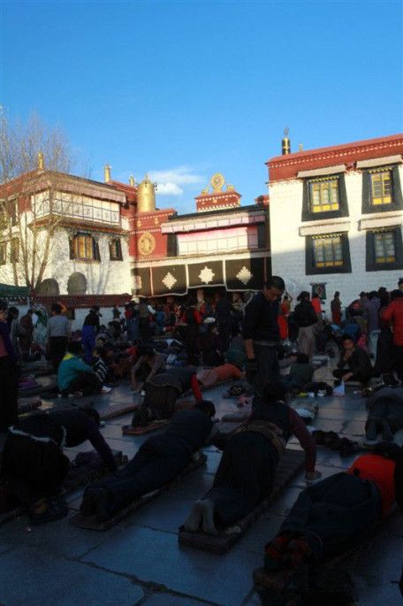 转出小巷,豁然开朗,眼前突然出现了一大片朝圣者,摩肩接踵,神情庄重,朝着一座建筑,匍匐、叩拜。难道,这就是大昭寺?我们原来真的就住在大昭寺的旁边,真是意外的惊喜。