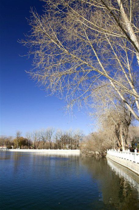 湿地边是一条水渠,水渠边栽种着树木,冬天树叶掉光了,光秃秃的树干伸向蓝天,倒映在蓝色的水中,没想到竟然这样美丽。