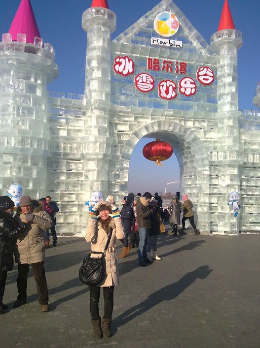 4号早上我们去江边看了千里冰封的松花江,在防洪纪念塔附近转了转,滑了一会冰,冻得实在是不行了。我们去的那几天据说是哈尔滨几十年来最冷的冬天,最低温度达到零下29度,下午五点我们去冰雪大世界看冰雕。冰雕晚上看才好看,门票200。我们提前准备了学生证的哦,你懂得!学生证可以半价,在里面可以玩很多的免费项目,大家都玩的很累,但也冻的不行。美不胜收的冰雕!晚饭在附近的妈妈菜馆里吃,还不错,价格不贵,份量也很足。