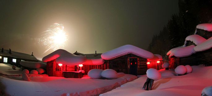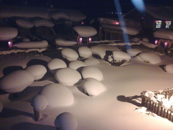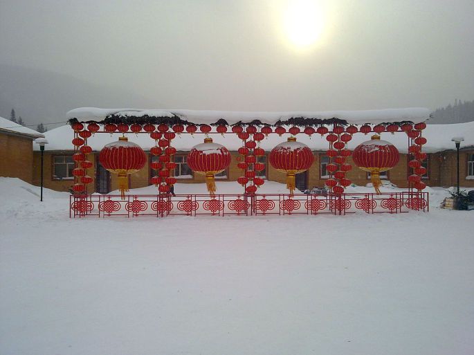 吃过晚饭,我们就要迫不及待的出去转转了,看看传说中的雪乡夜景。真的是满街的大红灯笼啊,本想让小王带着我们玩,但是怕他忙也就没好意思张嘴,逛了一会儿,就发现雪乡真的不大,就一条主道—雪韵大街,看看路两旁的小贩子们在那叫卖、吆喝,还挺有意思的,一串串的糖葫芦也是挺诱人的,但是这冷天我们可吃不下啊。溜达溜达,我们到了—梦幻家园,这地方挺有名的,在网上看到不少这的照片,都挺好看的。既然来了就不能留遗憾呐,门前的有个穿着狗皮大衣的小哥在把守着,我们到卖票的屋子里问了下票价,一人360,还说是什么大套票,包含观赏、二人装、滑雪圈等,我们想讲讲价便宜点进区看看,也都是私人开的景点,但是老板娘根本不买账,还牛哄哄的,我们只能走了,决定明天去求助小王。正好回去的路上路过小王家商店(瑞丰超市),我们就进去了,聊了一会才了解到,梦幻家园确实是当地挺有名的景点,但是他家与好多旅行社合作,所以游客才络绎不绝的,之所以价格那么高都被导游赚走了。我们让小王帮忙买低价票想进去玩玩,小王说明天有时间带我们“偷渡”进去,把逃票省下的钱玩点别的项目。我们自然是挺高兴,但是也有点担心。