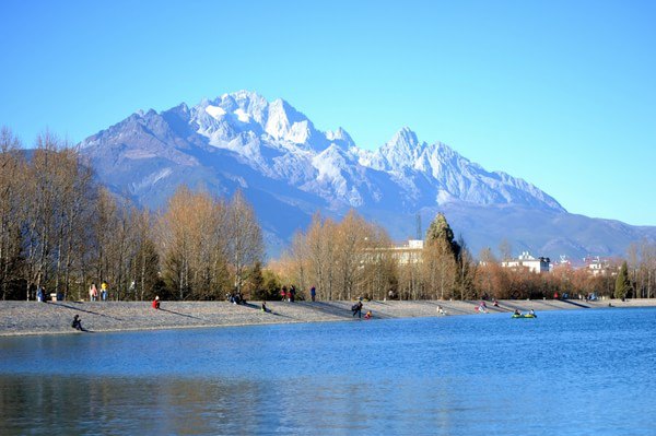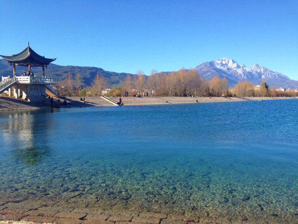 如诗画一样美,水很美,远处的玉龙雪山,以蓝天为背景,很是迷人,令人神往。