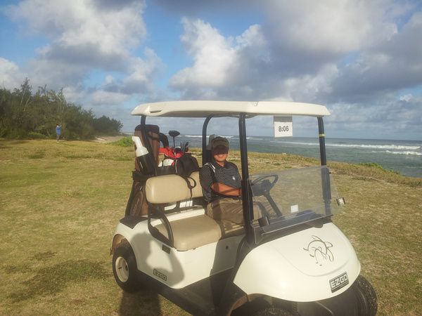 从出发站到一号洞,大约有1英里的距离,开上球车按照指示牌一路行驶,路上豁然看见浩瀚无边的太平洋,蓝天与蔚蓝的海水融为一体,近处翻滚起3、4米高的巨浪不断拍向海岸,海龟湾是夏威夷最著名的冲浪海域,每年各种冲浪比赛都集中在欧胡岛北岸,是冲浪爱好者的乐园。