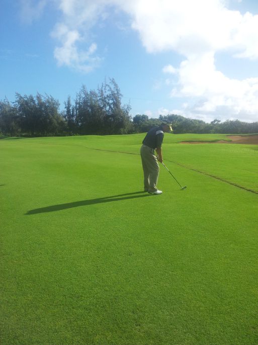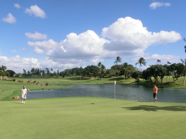 寇欧丽娜是典型的夏威夷式球场,从发球台便可清晰看到果岭旗杆,标准的锦标赛球场设计,球道总体平坦,没有OB,大气而又开阔的球道,看似容易,然而球道二边的长草区蕴藏极大的挑战,稍有不慎就无法找到落入其中的小白球;众多的炮台果岭,风向不定的海风,会让球友有一种不容易征服的巨大心理落差。当然,第一次在夏威夷打球,眼前碧蓝的天空、温暖的阳光,以及驾驶流动售货车、热情好客的波利尼西亚姑娘,还有远道而来,相聚甚欢的球友,真是人生一大幸事,都会让人不禁感慨:“啊,这才是人生”!