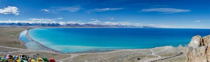 继续向上,到达第二个平台,视野一下开阔了许多。哇,这世界上最高最美的神湖真是让人震撼,脚下的湖水是由浅而深的蓝色,绿蓝、浅蓝、宝蓝、深蓝划出好几道,蓝得清澈,蓝得丰润,蓝得迷人,深邃广博,在阳光下闪着晶莹的涟漪。