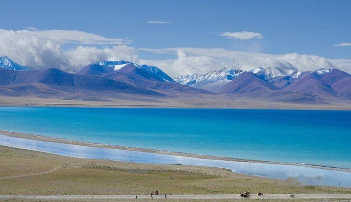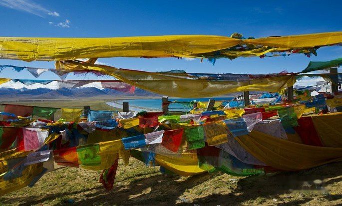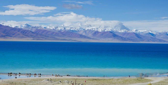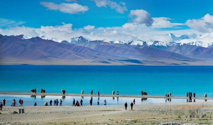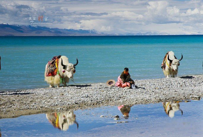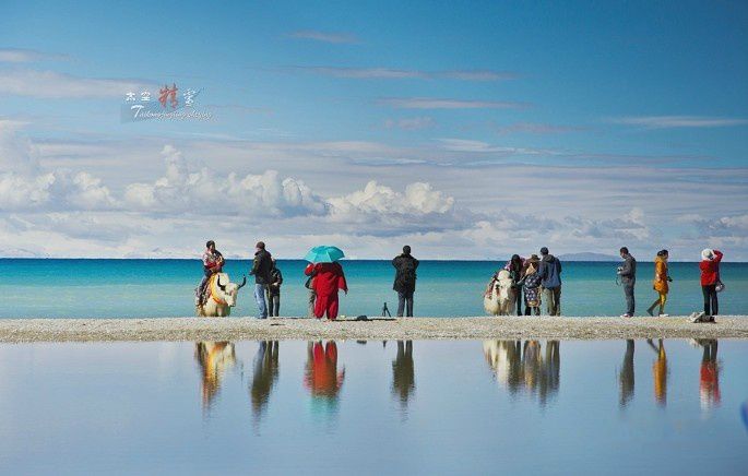然后下山来到湖边,伸向湖中的两条陆地上,许多白色的耗牛,招揽生意的藏人长袍,还有那些游人的红衣倒映水中,组成一幅生动的图画,活动在蓝天雪山和天湖之间。这条陆地神奇地将这一切展现在你面前,又与后面的深蓝湖水巧妙地结合到一块。