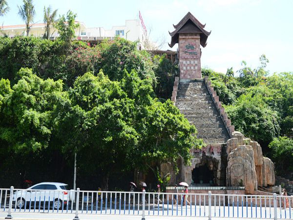 下午四点五十分,飞机缓缓降落在三亚凤凰机场。一出机舱,便再次领略了热带海岛的独特风情,天空湛蓝,浮云流动,空气湿润清爽。正当我深深呼吸着这怡人的气息时,手机响了,原来,酒店的接机人员已经在外面等候我们了。司机很热情,也很风趣,一路上跟我们讲着三亚好吃、好玩的地方。大约20分钟左右,便来到了酒店。酒店的洞里有一座电梯,乘电梯可以直达山顶酒店。”所以“一条水帘瀑布电梯直通山顶”确实是真的。