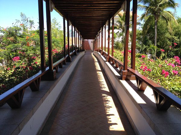 司机是一个海南人,虽然普通不是很标准,但却很热情的给我们介绍酒店。听着他的介绍,我注意到,酒店的建筑很有特色。酒店建筑依山就势,呈散开的院落型,随山势的高低起伏错落布置,呈不规则台阶状格局,层次分明。金黄色的屋顶很显眼,却与周围环境的色调十分协调。客房走廊为敞开式,随处可以感受到阳光的温柔与清风的俏皮。