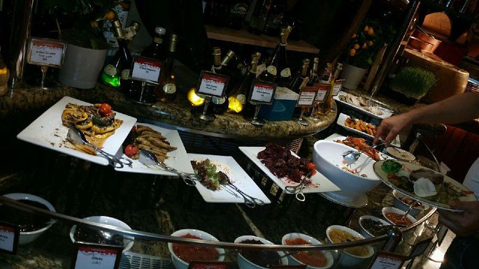 逛了很久,一点多我们到了棕榈岛,中餐就在这岛上最有名的亚特兰蒂斯酒店享用哦,超六星酒店,果然豪华,我们在水族馆旁的餐厅,几百种美食,牛排海鲜等任吃,最重要的是这里环境太好了,餐厅旁是水族馆最大的鱼馆,各种漂亮的鱼儿就在身边游来游去。