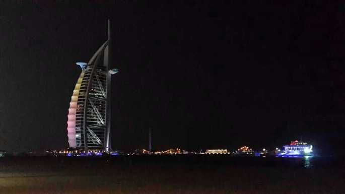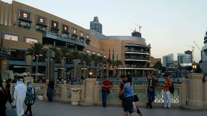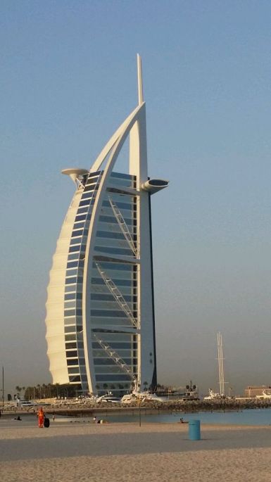 饱餐一顿后,下午来到迪拜有名建筑也是著名的七星级酒店外面,终于见到传说中的帆船酒店啦。随后出发到迪拜最大的购物商场和最好迪拜塔看夜景,导游告诉我们,现在迪拜的奢侈品价格和国内差不多,除非是打特价的,所以我们什么都没买,知识感受了商场里豪华建筑与设计,并在迪拜塔下观看了音乐喷泉!一天行程欢快结束,晚餐自理,在酒店附近的菲律宾餐厅喝了大骨汤,吃了点心,每人花了18元左右。